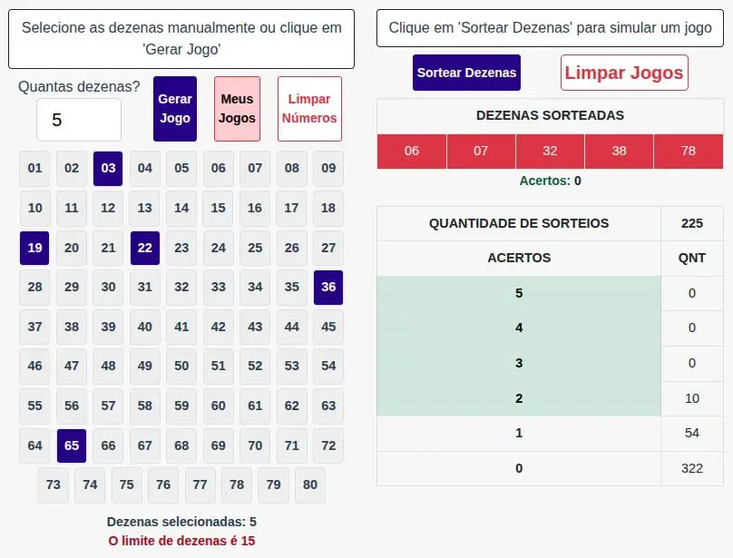 - Testes de jogos e combinações: É possível experimentar diferentes formatos de jogos — com 5, 6, 7 ou até 15 dezenas — e observar o desempenho de cada tipo de combinação em simulações automáticas.